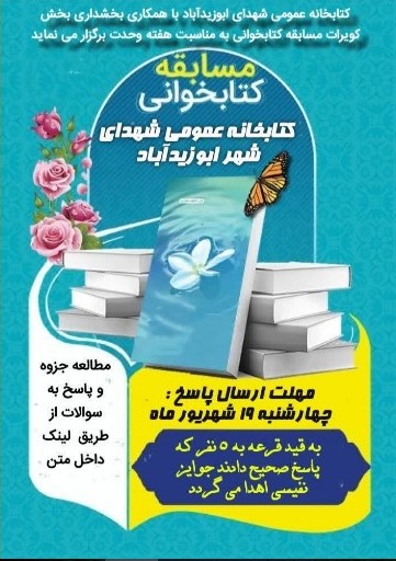 کتابخانه عمومی شهدای ابوزیدآباد با همکاری بخشداری بخش کویرات در سالروز ولادت رسول اکرم (صل الله علیه و آله و سلم) و امام جعفر صادق علیه السلام دومین مسابقه کتابخوانی را برگزار می کند: